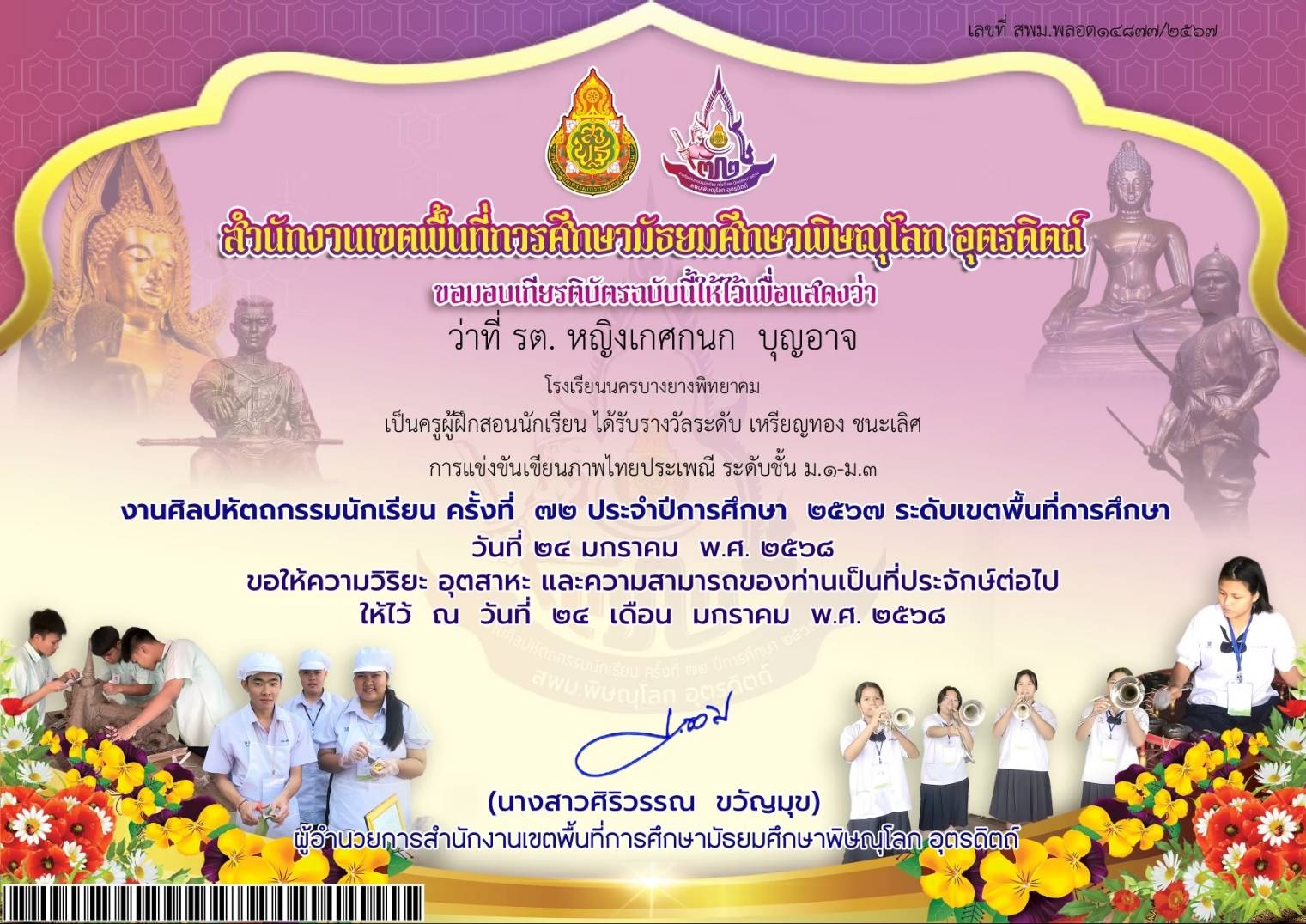 ชื่อผลงาน : ครูผู้ฝึกสอนนักเรียน ได้รับรางวัลระดับ เหรียญทอง ชนะเลิศ การแข่งขันเขียนภาพไทยประเพณี ระดับชั้นม.1-ม.3
